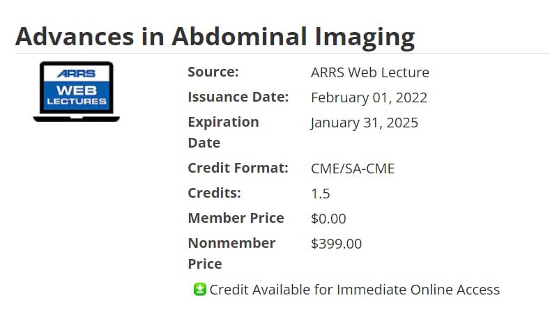 ARRS Advances in Abdominal Imaging 2022 This Web Lecture includes three lectures with an estimated time to complete the activity of 1.50 hour.