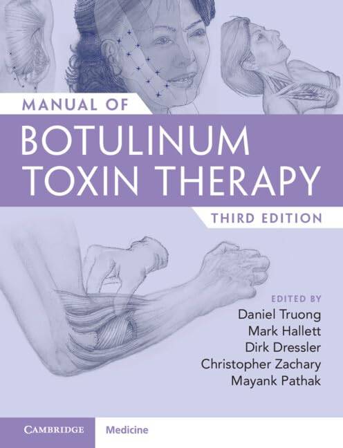 Providing practical, visually oriented guidance on the benefits of botulinum toxin in a wide variety of disorders, some new and unexpected, this new edition of Manual of Botulinum Toxin Therapy is fully updated in scope and detail. Chapters discuss the pathophysiology of each condition, summarizing the rationale for botulinum toxin, and describing the injection approach. Clear illustrations of the injection sites are included, using a ‘clinician’s eye’ perspective, which allows physicians to readily identify anatomical landmarks and approach angles for injection. Dosing tables for available toxin formulations are included. The Manual covers cosmetic treatment of the upper and lower face, as well as aesthetic smile correction. Extensive guidance on how to use ultrasound and how cadaveric dissections can assist localization and targeting of injections is provided. Designed for teaching and bedside guidance, the Manual is useful to a diverse range of clinicians looking to use botulinum toxin in their practice.
